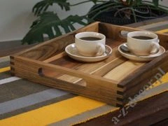 The wooden hand-decorated trays are made out of exotic wood varieties. We recommend trays with legs, which one can use for serving morning espresso coffee in bed. Useful for computer as well.
