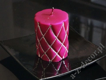 • Velvet pillar candle 8x10 cm in cerise color with silver glitter crate decoration.