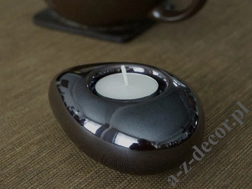 - Ceramic T-light candlestick in the shape of a river stone in the color of iridescent brown with silvery glaze. Delicate and extremely smooth.