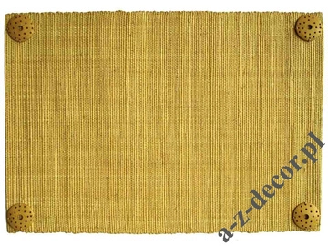 • Raffia placemat in honey color decorated with round coconut wood elements. The dimensions of the placemat: 33x48 cm.