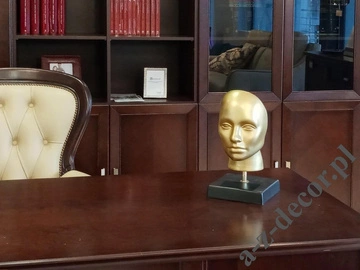 Decorative golden mask made of Portuguese ceramics. Square base, black glazed. The mask itself is slightly matted and a bit rough. Overall dimensions: 15.5 x 15.5 x 29 cm.