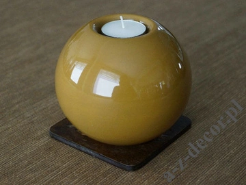 - Ceramic T-ligh holder in the shape of slightly flattened sphere, 12x10 cm in size, designed for tea light candles. It is glazed in light brown color.