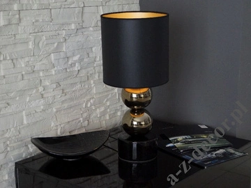 - Ceramic PERLA II night lamp in gold black version with dimensions of 25x56 cm. Extremely stable lamp from the rich PERLA collection. It has two gold balls, cylindrical black base and black lampshade lined with matt gold foil.