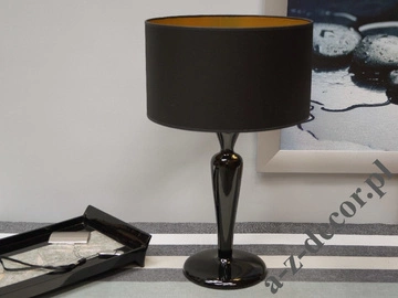 Elegant table lamp consisting of wooden, varnished black base and the lampshade with satin gloss. The golden interior of the lampshade gives unique effect when the lamp is turned on. The lamp with its simplicity will be the perfect decoration for a living room, bedroom or office.