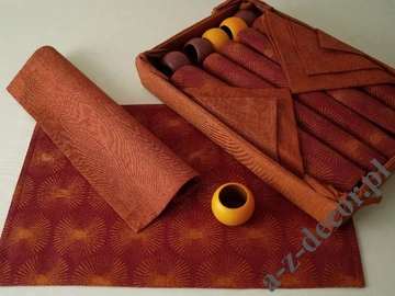 - Cotton table set for 6 person. It contains six fused 33x48cm jacquard placemats, six 40x40cm napkins and 6 wooden napkin rings.This set is packed in a rectangular 41x26x6 cm cotton bread basket. All in transparent shrink foil.