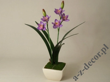 - Cymbidium orchid arrangement with pale, violet flowers in matt cream pot. The composition made of top quality materials which guarantee real look of artificial flowers. Dimensions: about 33x56 cm.