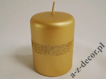 Świeca dekoracyjna w kształcie walca w odcieniach złota z brokatowym akcentem.