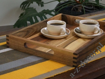 • Taca śniadaniowa o wymiarach 45x35x6 cm z drewna orzecha włoskiego o wyjątkowo nowoczesnym wyglądzie. Każdy egzemplarz będzie wyróżniać się innym oryginalnym rysunkiem słojów. Na uwagę zasługuje solidne, profesjonalne łączenie boków tacy.