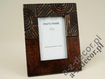 - Ramka na zdjęcie o formacie 10x15cm. Górna część z oryginalnymi rzeźbionymi wzorami. Na odwrocie solidne drewniane podparcie i haczyk pozwalający zawiesić ramkę na ścianie. Format całej ramki: 18x23 cm.