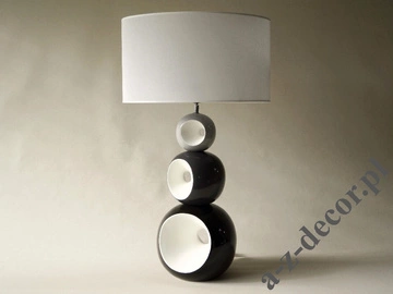 Lampa ceramiczna składająca się z trzech, stopniowo malejących kul z otworami w środku. Każda kula jest szkliwiona na inny odcień szarości z białym, matowym środkiem . Całość wykończona klasycznym owalnym, białym abażurem.