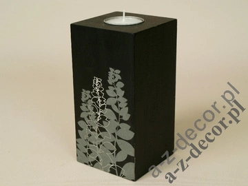 • Świecznik typu tea light o wymiarach 8x8x15cm. Matowoczarny ozdobiony fantazyjnym biało- srebrnym motywem roślinnym.