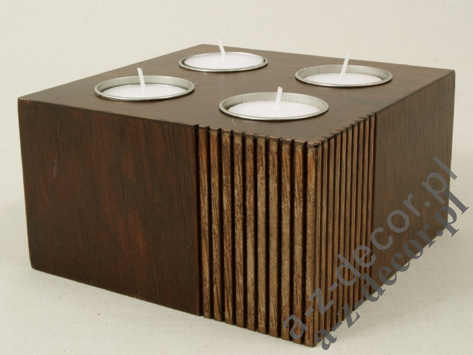 - Ciemno brązowy świecznik drewniany na świece typu tea light o wymiarach 14x14x8 m. Wykonany został z drewna. Jeden z boków świecznika ozdobiony pionowymi prążkami z przetarciami koloru. Cztery podgrzewacze są dołączone do zestawu.