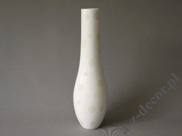 - Wazon ceramiczny o wymiarach 14x45cm. Ceramika w kolorze śmietankowym z połyskiem. Ozdobiona różnej wielkości kropkami w kolorze piaskowym o chropowatej powierzchni.