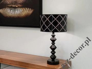 - Perfekcyjnie wykonana lampa na komodę z kolekcji ROLL GLOSS w stylu glamour w czarnym kolorze. Korpus lampy w całości wytoczony z drewna. Akrylowy abażur w kształcie walca, czarny z kraciastym wzorem i białym podbiciem.