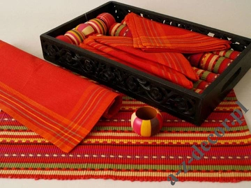 - Komplet dla 6 osób wykonany z bawełny. W skład zestawu wchodzi 6 podkładek o wymiarach 33x48 cm, 6 serwetek 40x40 cm oraz 6 drewnianych obrączek, całość umieszczona na drewnianej rzeźbionej tacy.