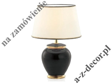 - Lampka nocna IMARI z ceramiczną podstawą emaliowaną na kolor czarny. Biały abażur ze złotymi pierścieniami. Parametry techniczne: E27 | Max: 60W | 230V lub E27 LED. Wymiary całkowite lampy 30x43 cm.
