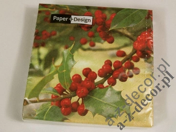 • Serwetki papierowe trzywarstwowe 33x33 cm, z motywem ostrokrzewu. 20 sztuk/opakowanie.