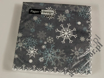 • Serwetki papierowe trzywarstwowe 33x33 cm z motywem płatków śniegu. 20 sztuk/opakowanie.