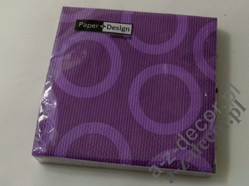 - Serwetki papierowe trzywarstwowe 33x33 cm. w kolorze fioletu z motywem jasno fioletowych pierścieni. W opakowaniu znajduje się 20 sztuk serwetek.