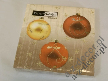 • Serwetki papierowe, trzywarstwowe 33x33 cm z motywem bombek świątecznych. 20 sztuk/opakowanie.