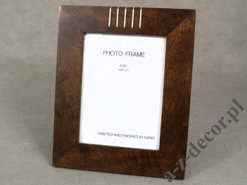 - Ramka na zdjęcia wykonana z drewna fikusa w ciemno brązowym kolorze, ozdobiona metalowymi klamrami. Ramka na odwrocie posiada trójkątny zaczep, który pozwoli ją również zawiesić na ścianie. Ramka ma wymiary 23,5x28,5 cm i zmieści zdjęcie 15x20 cm.